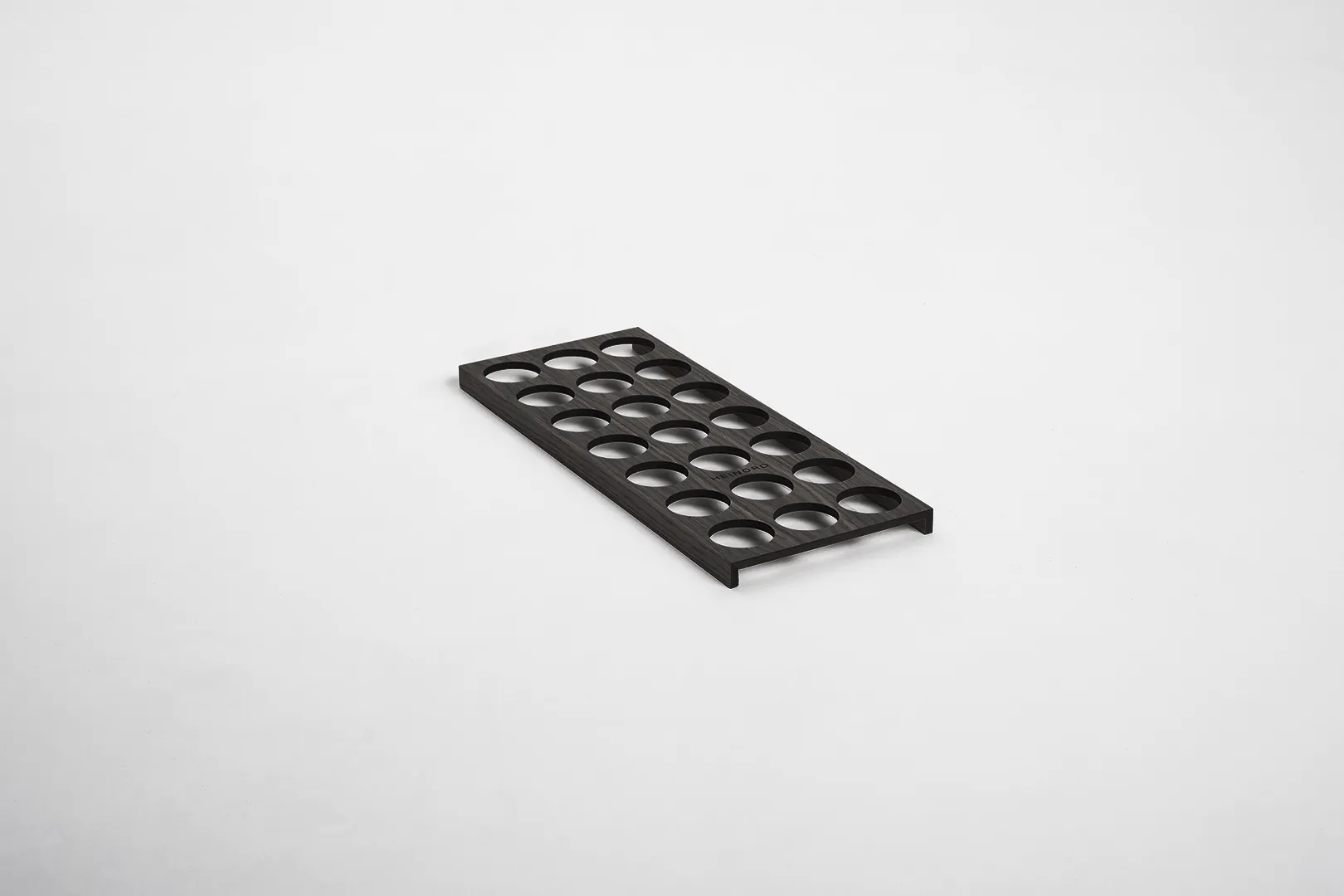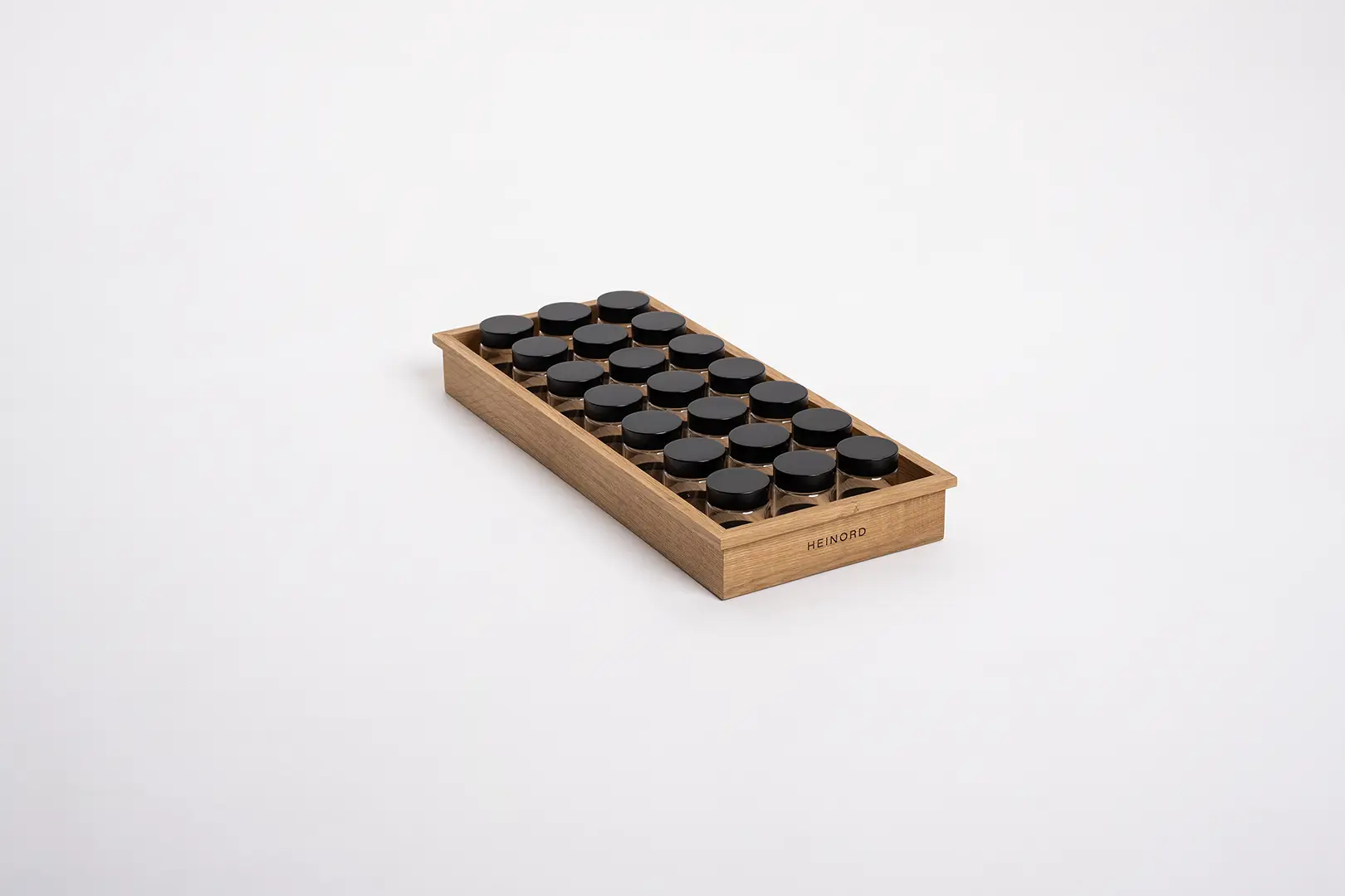 Eleganter Organizer aus massiver Eiche zur Aufbewahrung niedriger Gewürzgläser.
