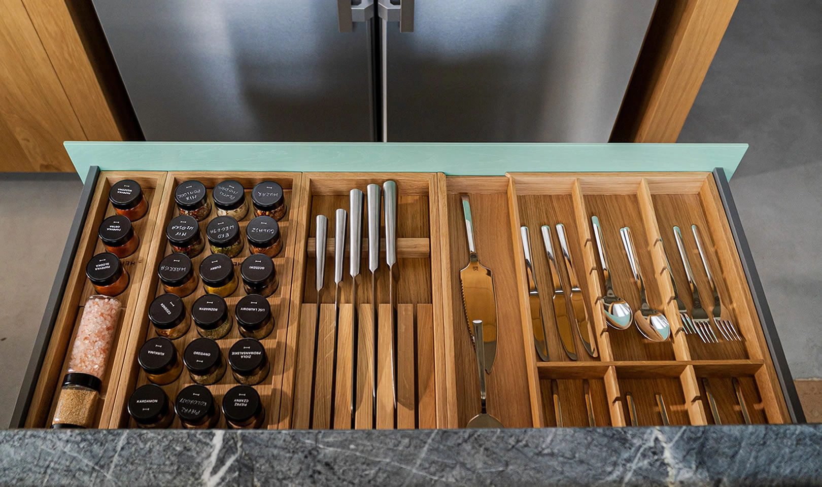Es gibt viele Küchenschubladen-Organizer, aber natürliches, massives Eichenholz ist ein einzigartiges Material in diesem Segment.